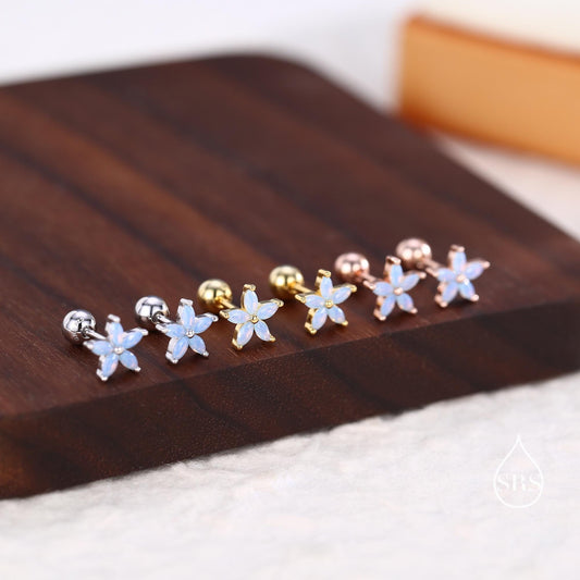 Opal Blue CZ Flower Screw Backs / Internally Threaded Flat Back / Stud Earrings in Sterling Silver, Silver or Gold, Forget Me Not Flower Stud