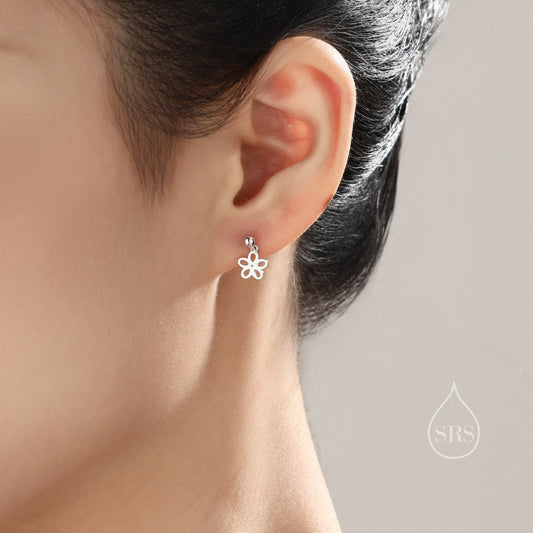 Daisy Flower Huggie Hoop Earrings in Sterling Silver, Two Sizes, Curved Post Earrings, Open Hoops, Pull-Through Threader Earrings,