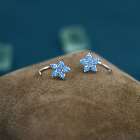 Blue Forget-me-not Flower CZ Huggie Hoop Earrings in Sterling Silver, Curved Post Earrings, Open Hoops, Pull-Through Threader Earrings,