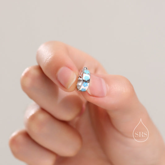 Sterling Silver Enamel Forget Me Not Thick Huggie Hoops, Tiny and Delicate, Dainty Dangle Blue Flower Earrings, Flower Hoops? Daisy Hoops