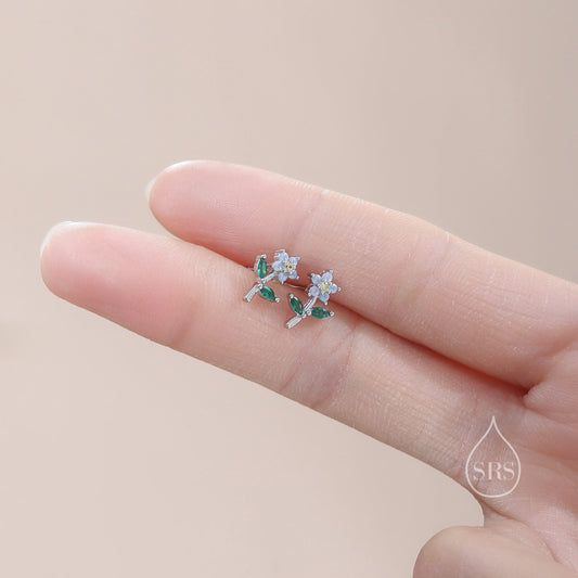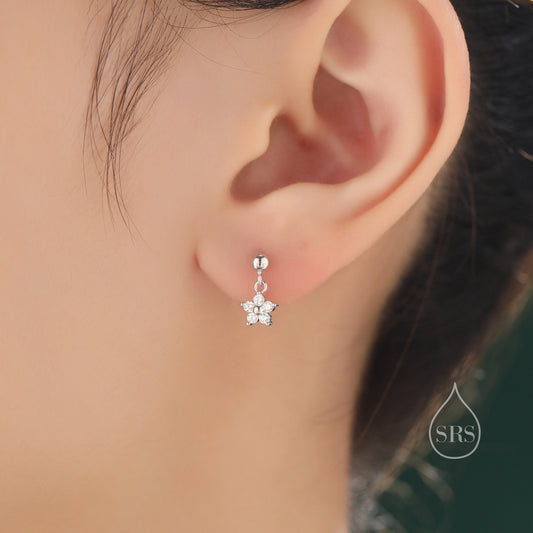 Sterling Silver Dainty CZ Flower Drop Stud Earrings, Dainty Dangle Daisy Flower Earrings, Silver Forget Me Not Tiny Earrings