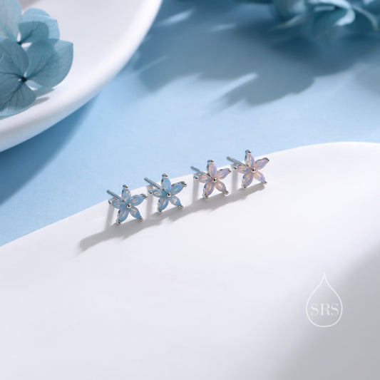 Opal Blue CZ Flower Stud Earrings in Sterling Silver, Silver, Gold or Rose Gold, Delicate CZ Flower Stud Earrings