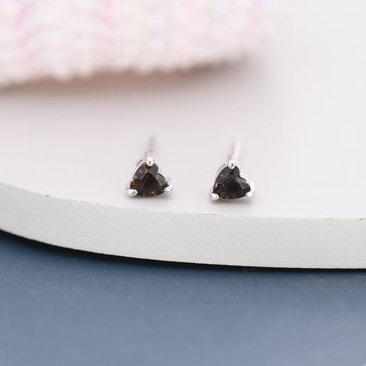 Genuine Smoky Quartz Crystal Heart Stud Earrings in Sterling Silver, 3mm Heart Stud Earrings, Tiny Heart Earrings