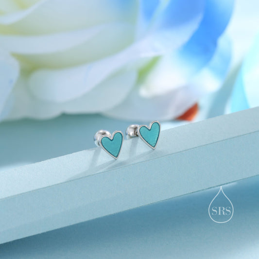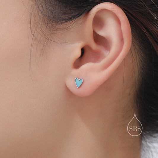 Aqua Blue Enamel Glaze Heart Stud Earrings in Sterling Silver, Delicate Heart Earrings, Tiny Heart Earrings