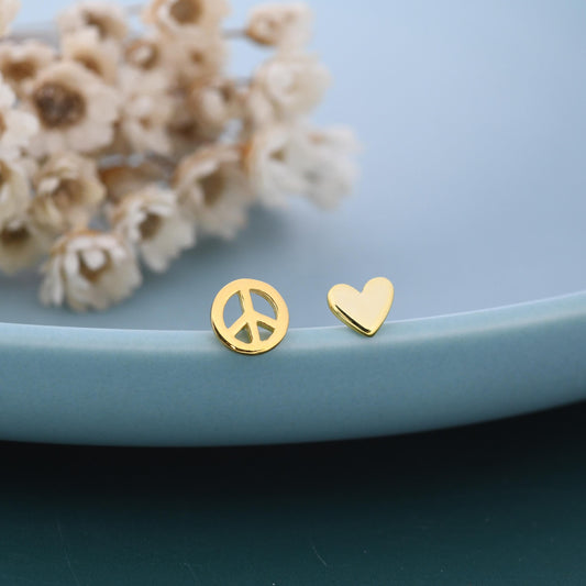 Tiny Mismatched Peace and Love Stud Earrings in Sterling Silver, Silver, Gold or Rose Gold, Small Asymmetric Heart and Peace Earrings