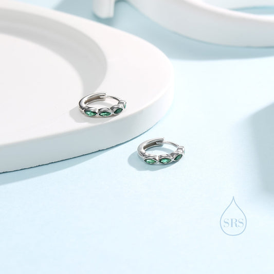 Emerald Green Marquise CZ Huggie Hoop in Sterling Silver, Silver or Gold, Minimalist Simple Green Hoop Earrings