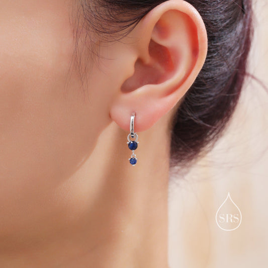 Double Sapphire Blue CZ Huggie Hoop Earrings in Sterling Silver, Silver or Gold, Detachable Charm Hoops, Geometric Hoop Earrings