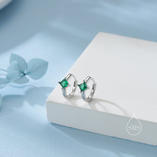 Emerald Green CZ Huggie Hoops in Sterling Silver, Silver or Gold, Minimalist Hoop Earrings, 8mm Hoops, Green Crystal Hoops