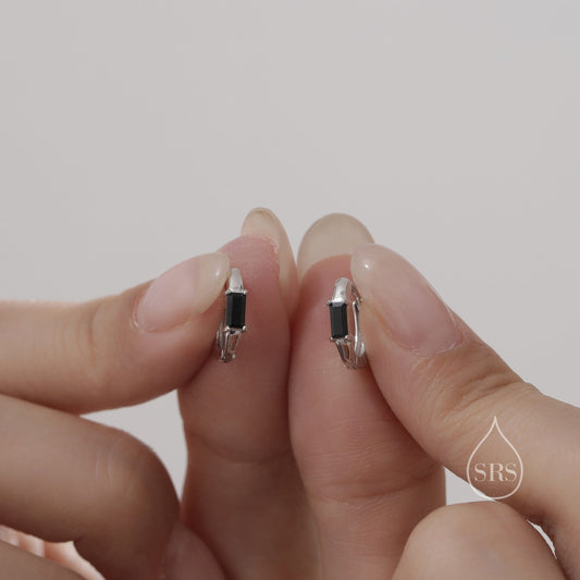 Black Single Baguette Cut CZ Huggie Hoop in Sterling Silver, Silver or Gold, Minimalist Simple Black Hoop Earrings