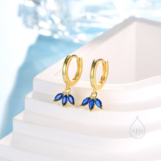 Sapphire Blue CZ Marquise Crown Huggie Hoop Earrings in Sterling Silver, Silver or Gold, Geometric Hoop Earrings