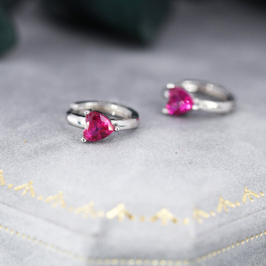 Ruby Red Heart CZ Huggie Hoop in Sterling Silver, Silver or Gold, 8mm Inner Diameter, Stacking Earrings
