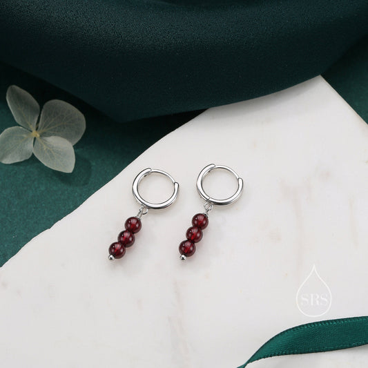 Genuine Garnet Stone Trio Huggie Hoop Earrings in Sterling Silver, Red Garnet Cluster Dangle Earrings, Three Stone Hoops, January