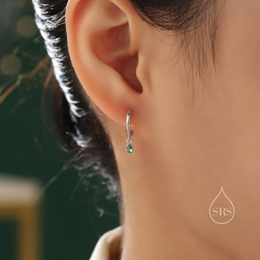Tiny Dotted Droplet Emerald Green CZ Huggie Hoop Earrings in Sterling Silver, Silver or Gold, Geometric Hoop Earrings, Vintage Inspired