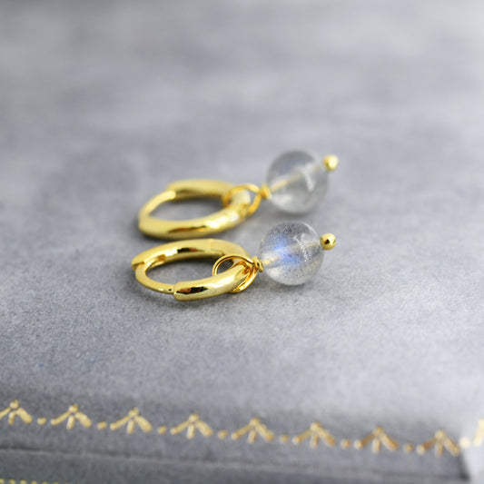 Genuine Labradorite Stone Beaded Huggie Hoop Earrings in Sterling Silver, 6mm Labradorite Hoops, Detachable Charms