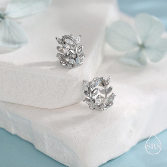 CZ Olive Leaf Huggie Hoop in Sterling Silver, Silver or Gold, 8mm Inner Diameter, Nature Inspired Earrings
