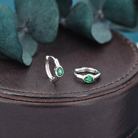 Emerald Green Single Pear Cut CZ Huggie Hoop in Sterling Silver, Silver or Gold, Minimalist Simple Green Hoop Earrings, Dainty Green Hoops