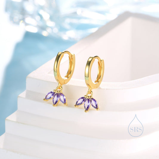 Amethyst Purple Crown CZ Huggie Hoop Earrings in Sterling Silver, Silver or Gold, Geometric Hoop Earrings