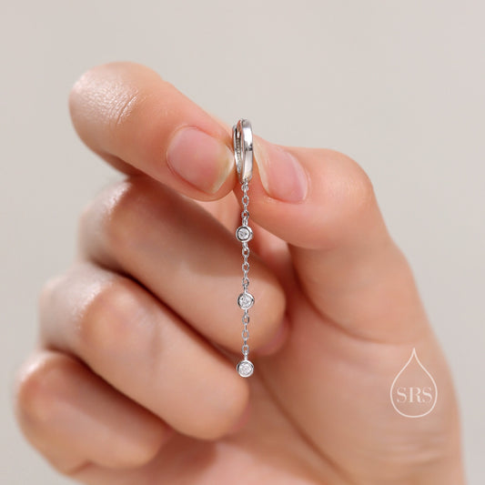 Tiny CZ Trio Chain Dangle Huggie Hoop in Sterling Silver, Silver or Gold or Rose Gold, Skinny Three CZ Drop Earrings