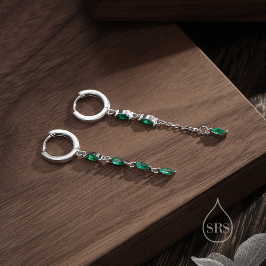 Asymmetric Marquise CZ Dangle Huggie Hoop Earrings in Sterling Silver with Emerald Green CZ, Silver or Gold, Geometric Hoop Earrings