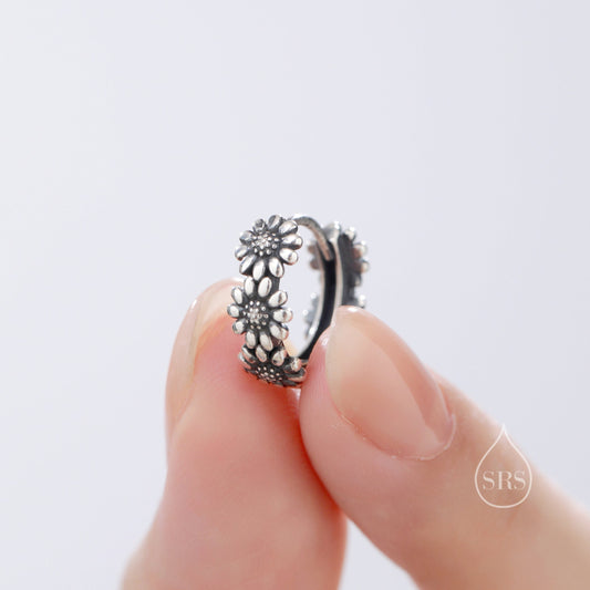Oxidised Silver Daisy Flower Chain Huggie Hoop in Sterling Silver, Delicate Flower hoop Earrings, Floral Earrings, 10mm Inner Diameter