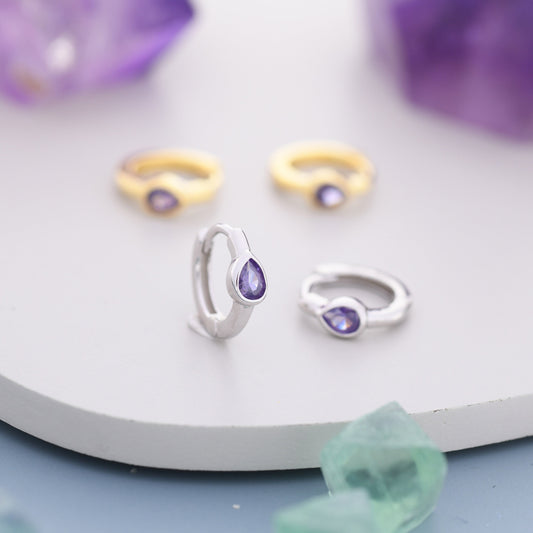 Amethyst Purple Pear Cut CZ Huggie Hoop in Sterling Silver, Silver or Gold, Minimalist Simple Amethyst Purple Hoop Earrings