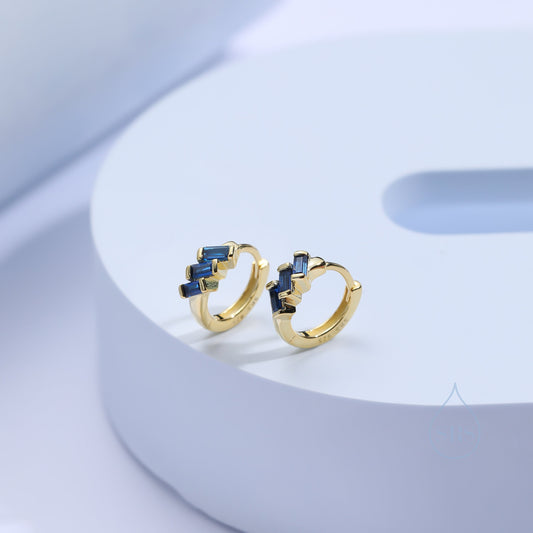 Sapphire Blue Baguette CZ Cluster Huggie Hoop in Sterling Silver, Silver or Gold, Geometric Hoop Earrings