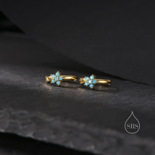 Turquoise CZ Flower Huggie Hoop in Sterling Silver, Silver or Gold, Delicate Flower CZ Hoops, Tiny Flower Hoops, Tiny CZ Hoops