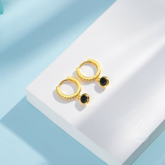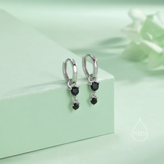 Tiny Black CZ Dangle Huggie Hoop in Sterling Silver, Silver or Gold, Skinny CZ Dangle Earrings, CZ Hoops