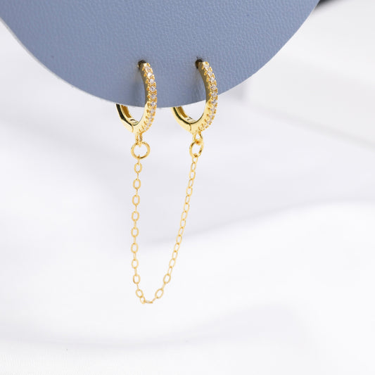 CZ Huggie Hoop Earrings with a Linking Chain, Chained Hoop Earrings, Linked Hoops, Linked Crystal Hoops