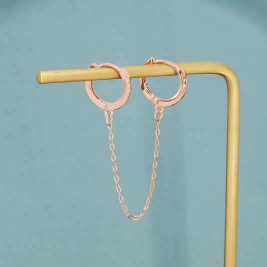 Sterling Silver Double Piercing Huggie Hoop Earrings with Linking Chain, Chained Hoop Earring, Linked Hoops, Double Piercing Hoops