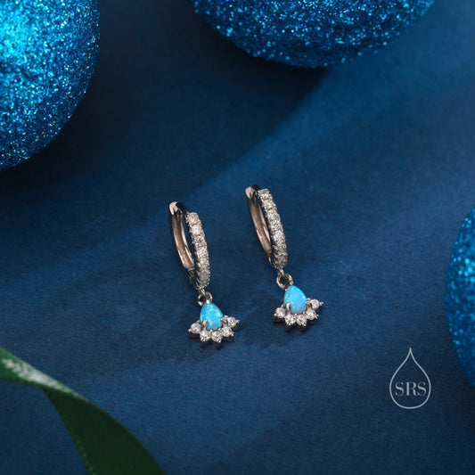 Sterling Silver Opal and CZ Crown Huggie Hoops, CZ Opal Fan Shape Hoop Earrings, Dainty Dangle Earrings, Blue Opal Earrings