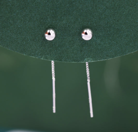 Minimalist Ball Threaders Earrings in Sterling Silver, 4cm Ball Ear Threaders with a Short Chain