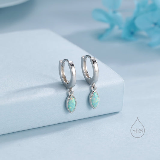 Marquise Aqua Green Opal Huggie Hoops in Sterling Silver, 8mm Opal Hoops, Silver or Gold, Fire Opal Earring