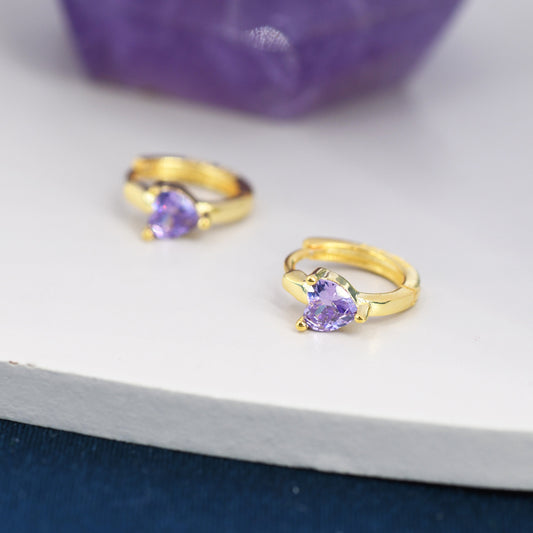 Amethyst Purple CZ Heart Huggie Hoop in Sterling Silver, Silver or Gold, 8mm Inner Diameter, Stacking Earrings