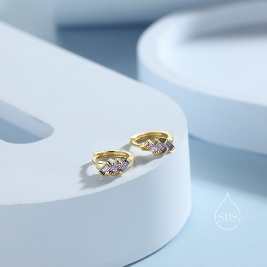Amethyst Purple Baguette Cut CZ Huggie Hoop Earrings in Sterling Silver, Silver or Gold, Open Hoops, Pull-Through Threader Earrings