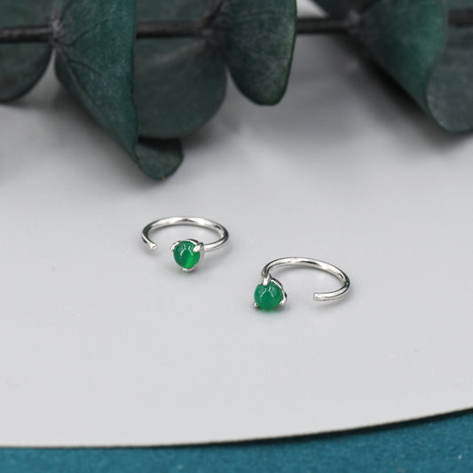 Genuine Green Onyx Huggie Hoop Earrings in Sterling Silver, 3mm Natural Green Onyx Open Hoops, Pull Through Threaders, Half Hoops, C Shape