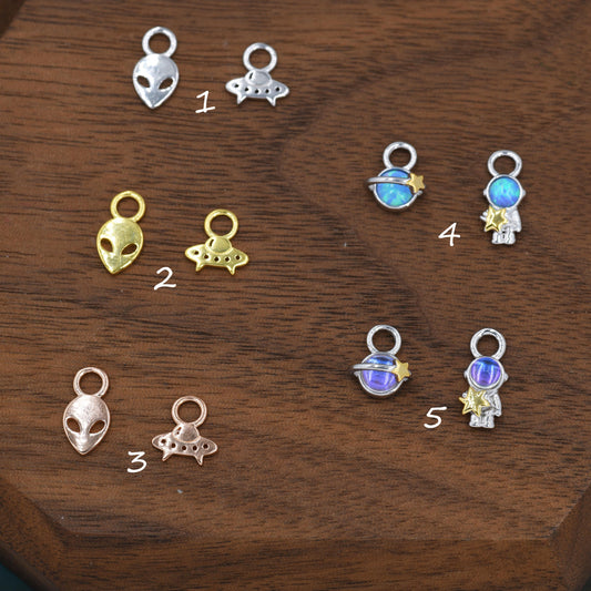 Mismatched Pair of Extraterrestrial Charms for Huggie Hoops in Sterling Silver, Alien and Spaceship Charms, Silver, Gold or Rose Gold Finish