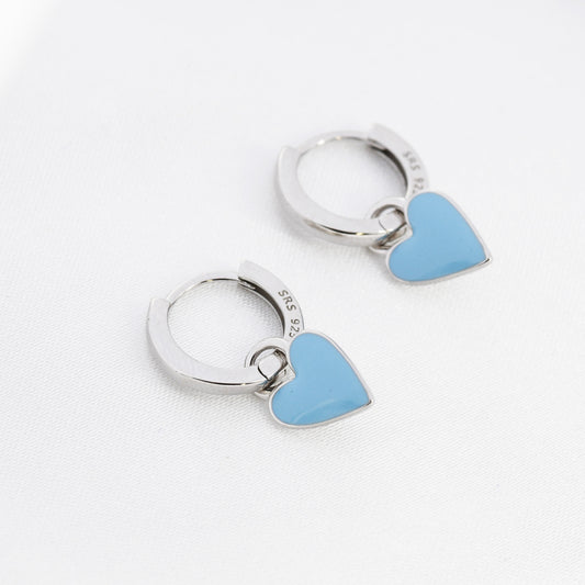 Sky Blue Enamel Heart Earrings in Sterling Silver, Detachable Heart Charm Dangle Hoop Earrings, Interchangeable
