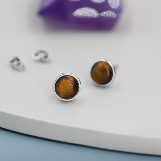 Genuine Tiger's Eye Stud Earrings in Sterling Silver, 6mm, Cabochon Bezel Stud Earrings, Tiger Eye Stone Earrings