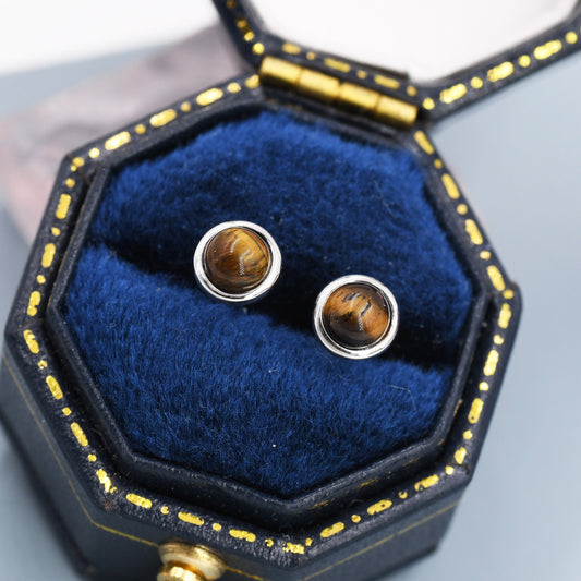 Genuine Tiger‘s Eye Stud Earrings in Sterling Silver, 4mm, Cabochon Bezel Stud Earrings, Tiger Eye Stone