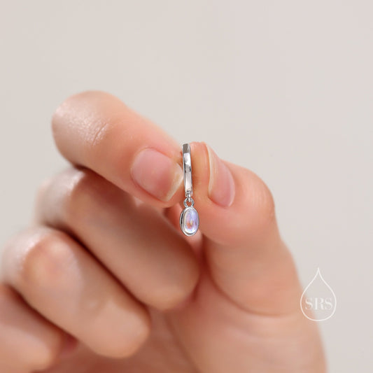 Sterling Silver Dangling Oval Moonstone Hoop Earrings, Lab Moonstone Charm Dangle Hoop Earrings, Silver or Gold