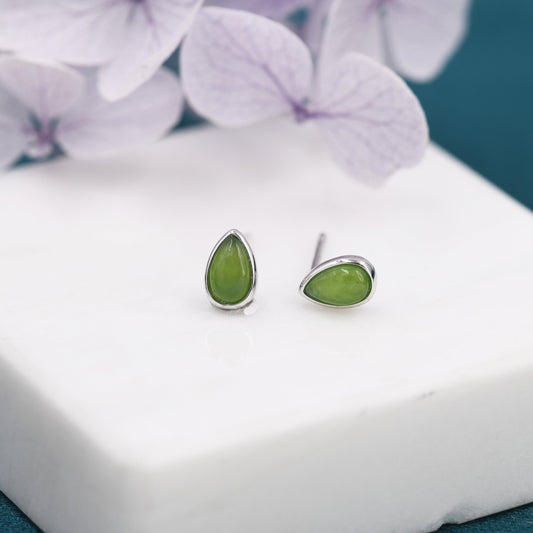 Genuine Jade Pear Stud Earrings in Sterling Silver, Jade Bezel Stud Earrings, Tiny Jade Droplet Earrings