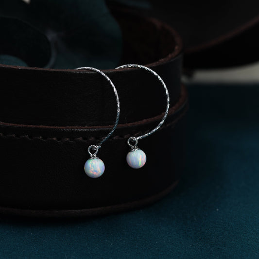 White Opal Bead Dangle Earrings in Sterling Silver, 15mm Hook Earrings, Round Hoop Lab Opal Beaded Earrings