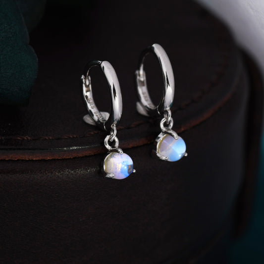 Sterling Silver 4mm Moonstone Hoop Earrings, Lab Moonstone Dangle Hoop Earrings, Silver or Gold
