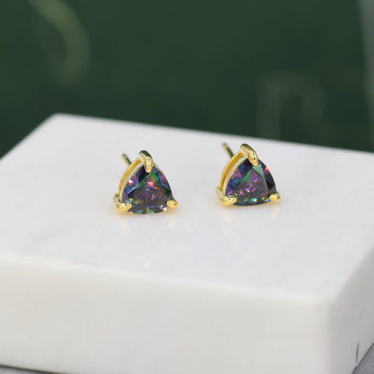 Mystic Topaz Trillion Cut Stud Earrings in Sterling Silver, Gold Coated, 6mm Trillion Cut, Lab Mystic Black Topaz Earrings