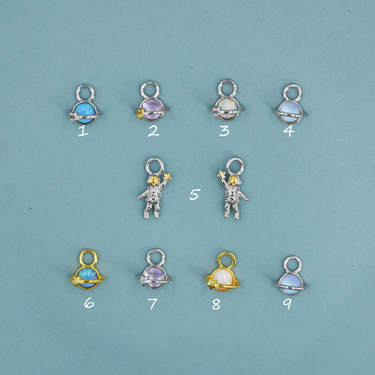 Extra Terrestrial Charms for Huggie Hoops – Planet and Astronaut Charms in Sterling Silver, Silver or Gold Finish