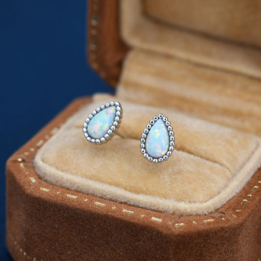 Sterling Silver Opal Droplet Earrings, Pear Shape White Fire Opal Stud Earrings, Silver or Gold, Dotted Bobble Beaded