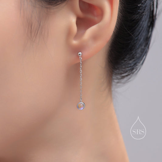 Blue Opal Dot Long Threader Earrings in Sterling Silver, Lab Opal Coin Ear Threaders, Silver or Gold, Opal Threaders