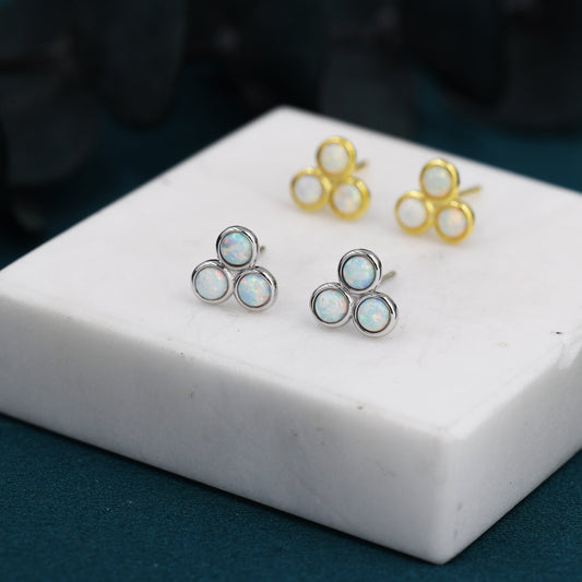 White Opal Trio Dot Circle Stud Earrings in Sterling Silver - Silver or Gold - Geometric Minimalist , Fire Opal Trio Earrings, Three Opals