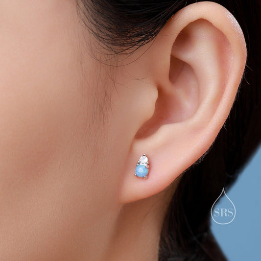 Sterling Silver Tiny Blue Opal and CZ Stud Earrings, Tiny Opal Earrings, Blue Opal, Lab Opal Stud